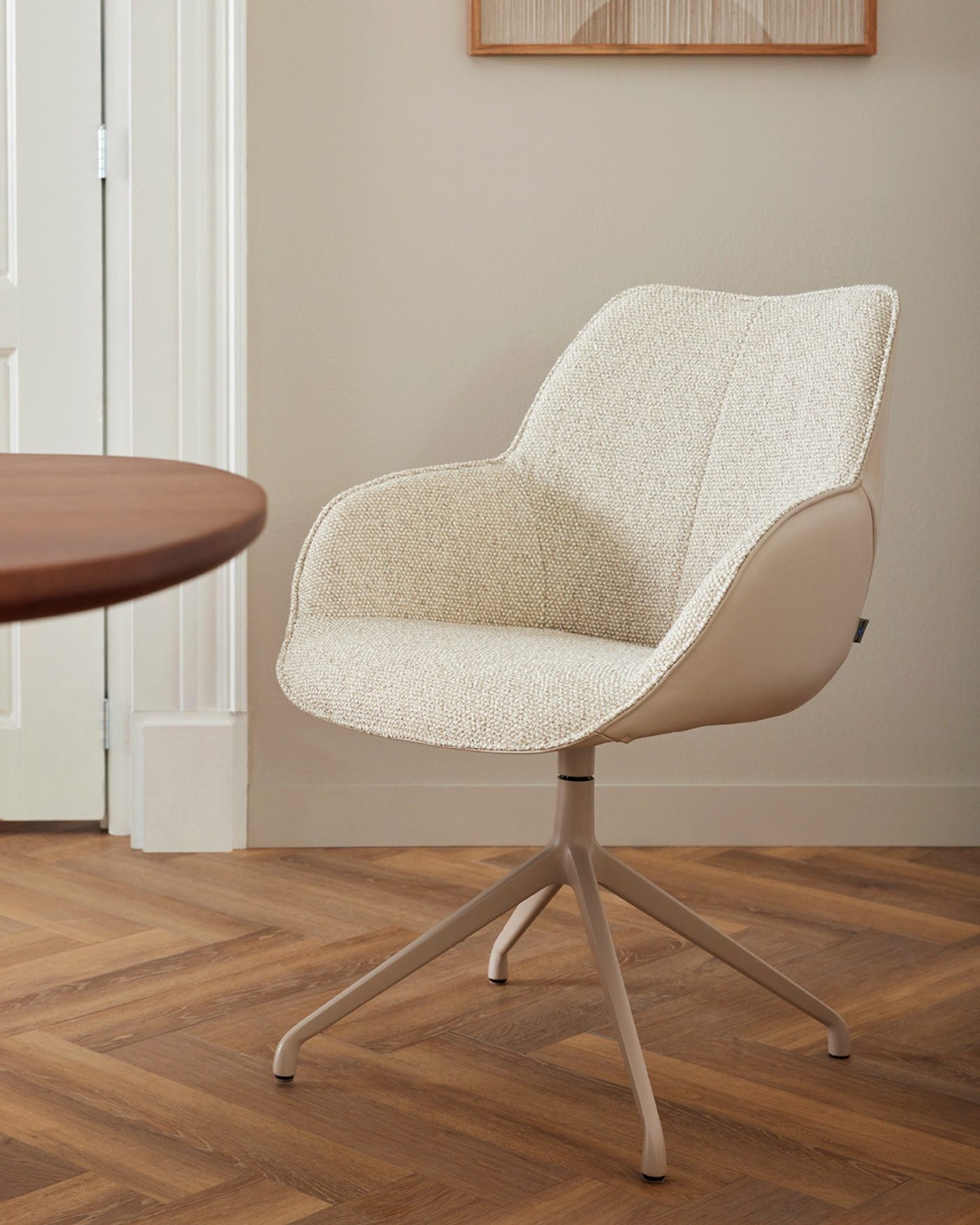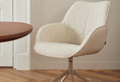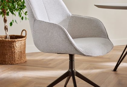 Een zachte, uitnodigende stoel met een moderne uitstraling, ideaal voor lange diners aan tafel.